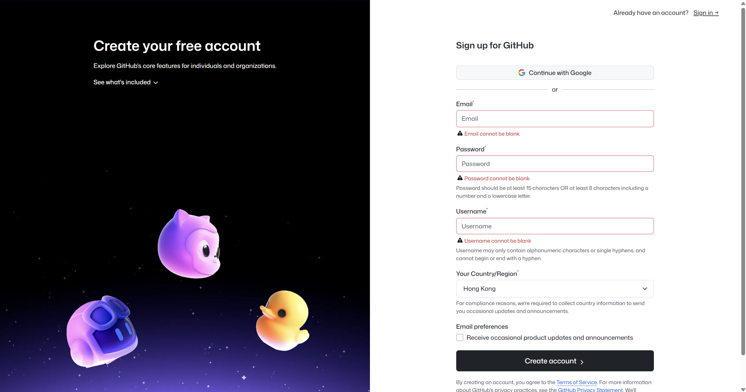 填写用户名、邮箱和密码,点击“Create account”按钮,然后按照教程一步一步创建账户,完成注册。